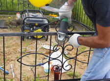 Для начала необходимо зачистить ограду от старой краски. Мы выполняем эту работу механическим путем.
